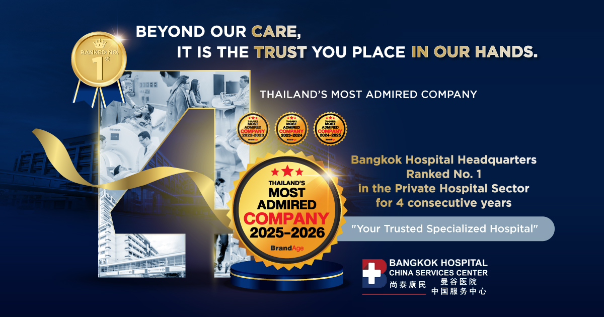 泰国曼谷医院(Bangkok Hospital)总院再次被评选最值得信赖的健康服务提供者的地位,荣获 Thailand’s Most Admired Company 2025–2026 奖项,在私立医院业务组中连续4年(2022–2026)位居最受信赖医院第1名。该结果来自 BrandAge 杂志的调查,反映出服务使用者持续不断的信心与信任。