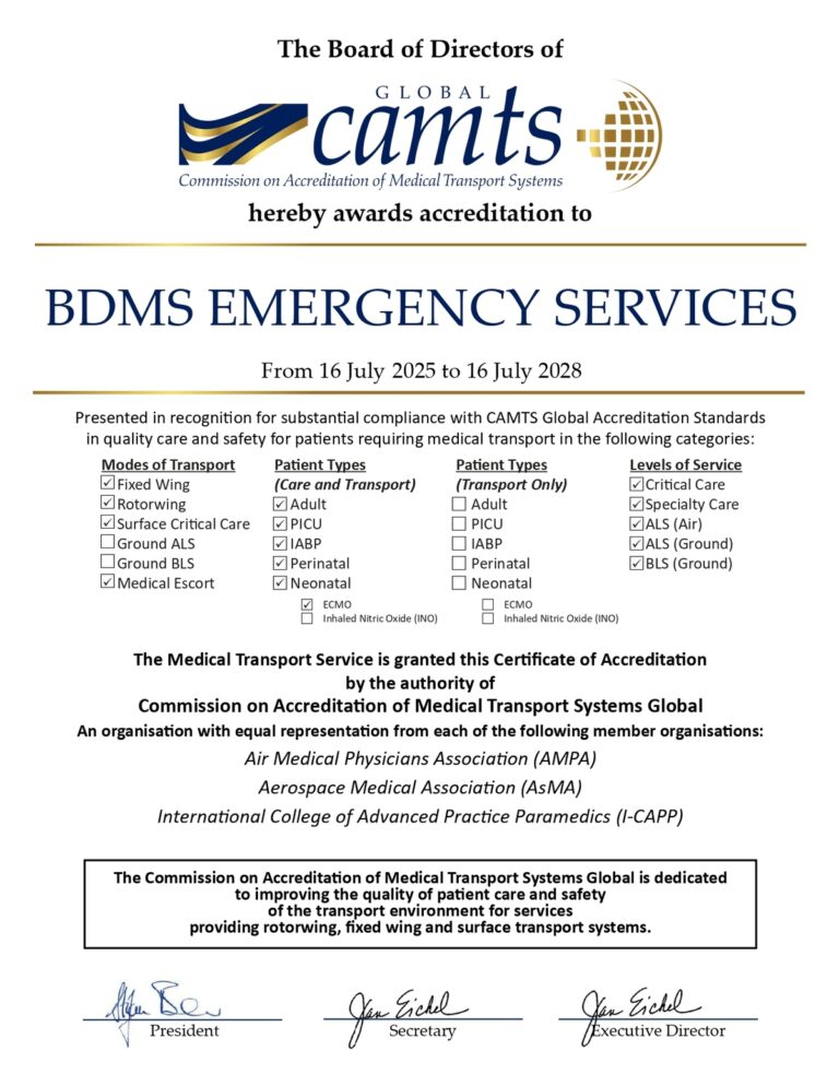 2025年6月25日,泰国曼谷医院医疗集团(BDMS医疗集团)急救中心再次获得医疗运输系统认证委员会(CAMTS)的认证,时间为2025年-2028年。泰国曼谷医院医疗集团急救中心是一家综合性的患者护理与运输服务的医院,其服务方式包括: